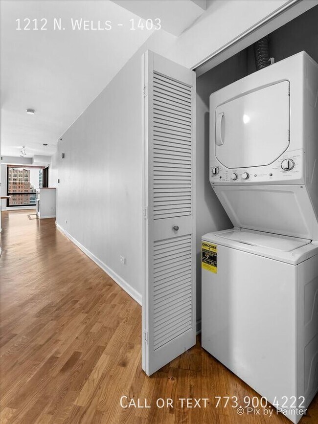 Bright, spacious layout, One bedroom with dining or den area, one and a half baths, with hardwood floors, modern features, laundry in-unit, and a balcony overlooking Wells St and City Views.