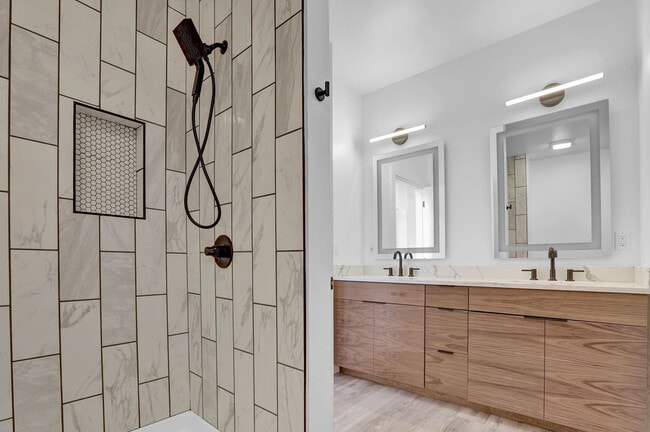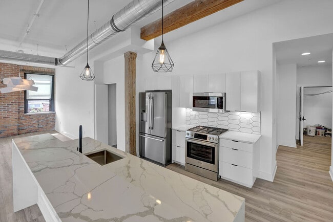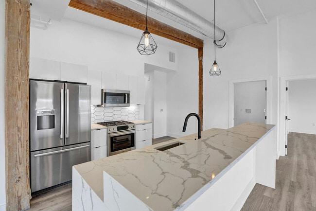 Every unit has unique custom cabinetry with sleek and modern European stylized designs; these are topped with stunning quartz or Corian countertops to round out the premium look and feel for every cooking experience. Combining the historic nature of the building with premium modern finishes, there are beautiful sections of exposed and restored brick throughout the community and featured in most of the homes. Hyper-modern tile design in the bathrooms gives a beautiful, extremely clean, and durable product that will be a highlight of your home. These features and more are highlighted with tremendous amounts of natural light from the over-sized windows as well as the multitude of beautiful LED lighting to help set the perfect tone for every occasion.