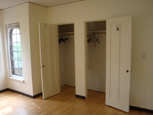 A spacious master bedroom, 17' x 15', double door closet