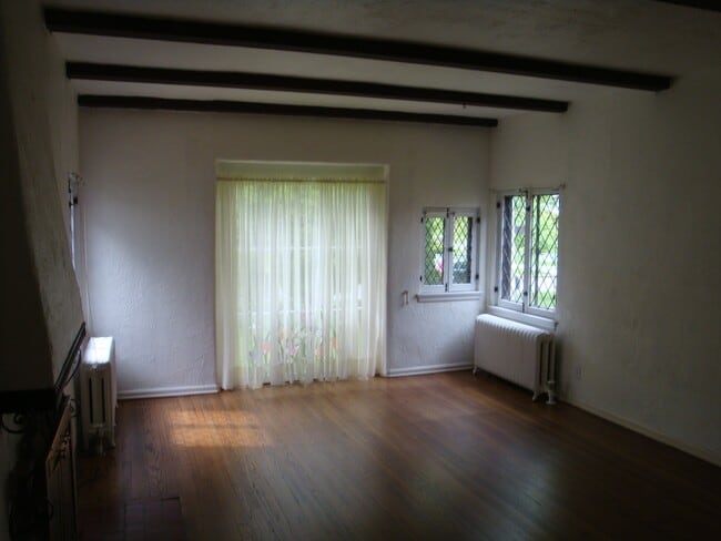 Wood Beams frame this spacious living room and dining room